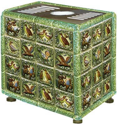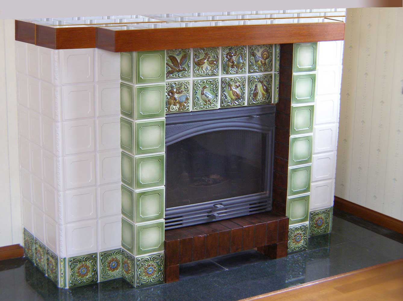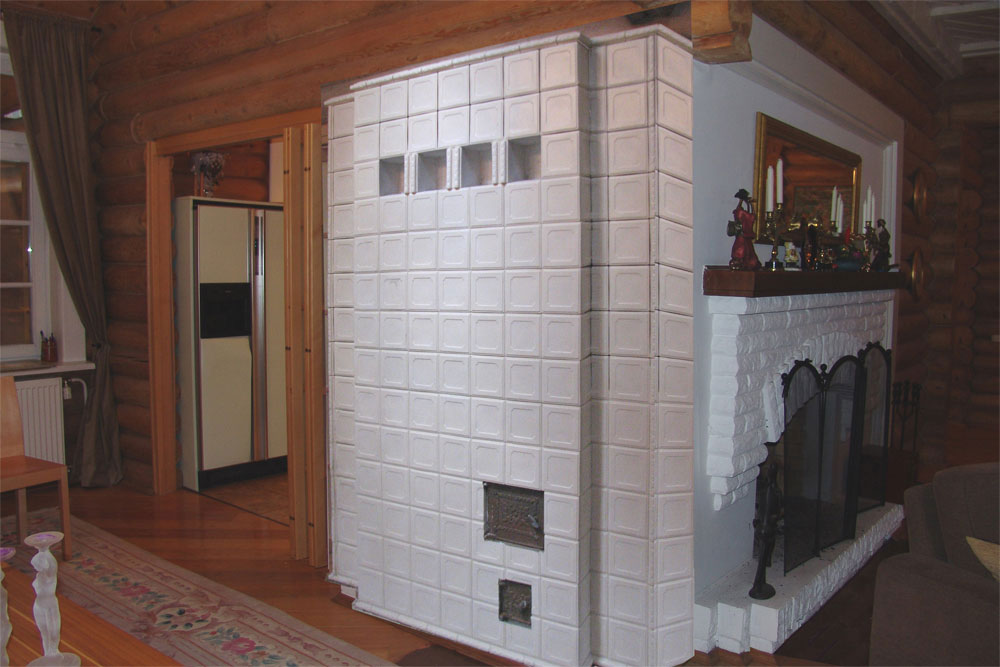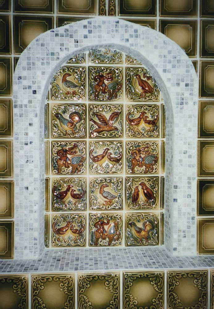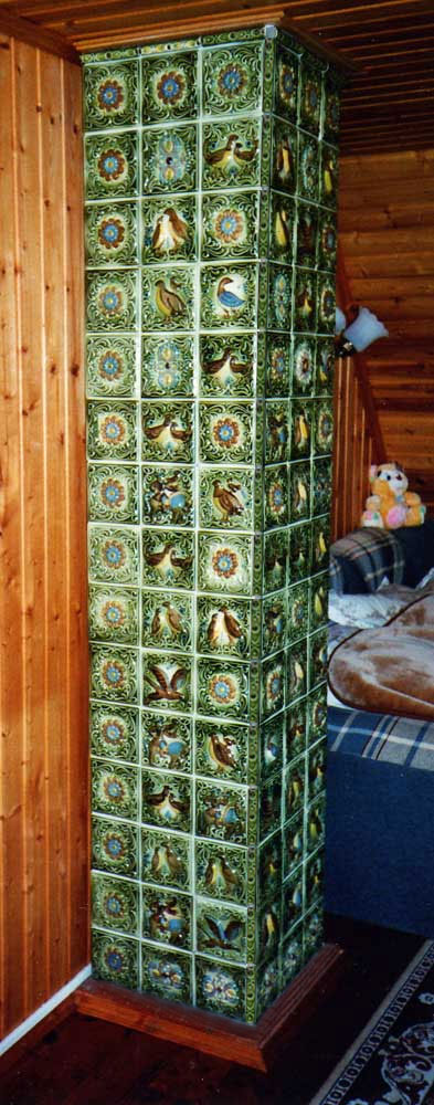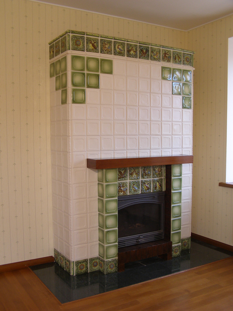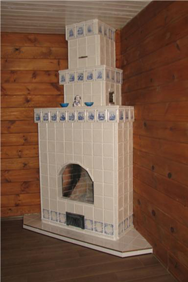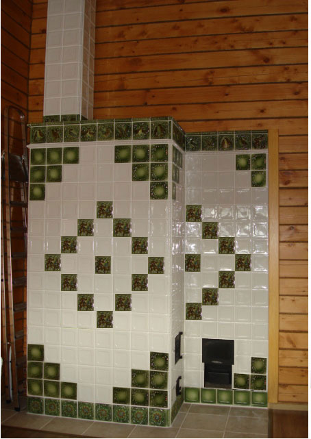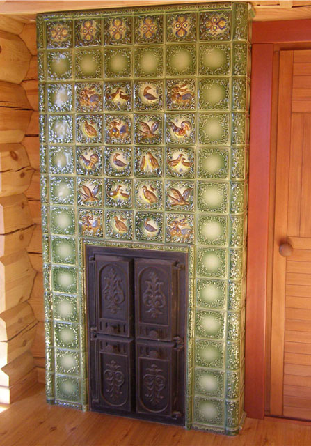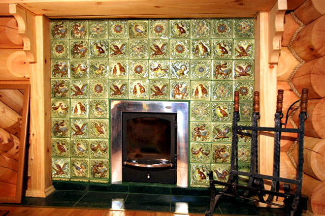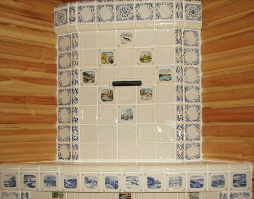 | 22. Изразцовый камин с чугунной решеткой с отделкой изразцами коллекции «Охота на птиц». 23. Стенка печи в сауне облицована изразцами коллекции «Охота на птиц». |