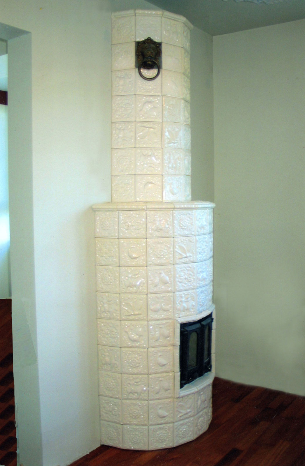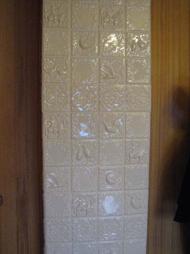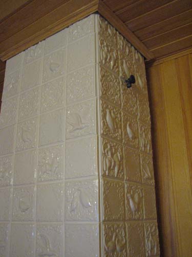 | 13. Труба на 2-м этаже облицована изразцами коллекции «Охота на птиц» белого цвета без применения угловых элементов 14. Фрагменты трубы. 15. Фрагменты трубы. |