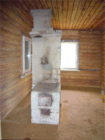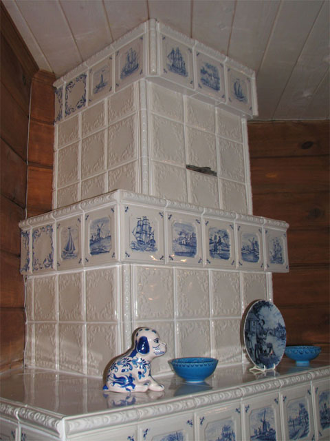 | 6. Изразцовый камин облицован изразцами коллекций "Орнамент - рамка" белого цвета с поясами и панно из изразцов коллекций "Гжельские мотивы" и "Русские пейзажи". 7. Фрагмент изразцового камина. |