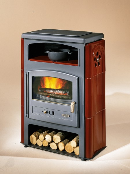 Корпус выполнен их чугуна и стали, оформлен декором из фаянса. Возможные расцветки: корица, королевский синий, бордовый. Имеется ниша для дров.