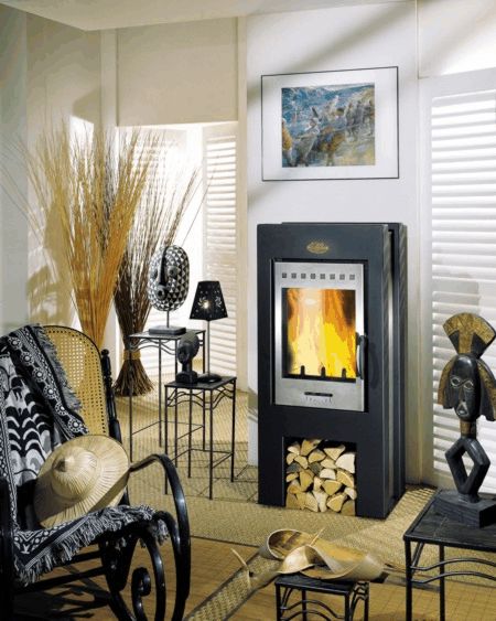 Имеется фронтальная загрузка дров. Корпус выполнен их чугуна и стали. Варианты расцветки: черный, нержавеющая сталь.