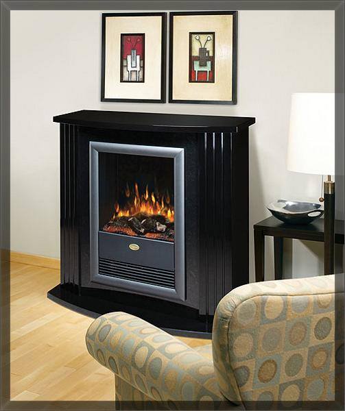 Обогрев осуществляется при помощи тепловентилятора, а встроенный термостат позволяет регулировать его уровень. Режим обогрева не влияет на эффект пламени. Белый портал облицован "под камень" с панелью, выполненной с эффектом черного мрамора.