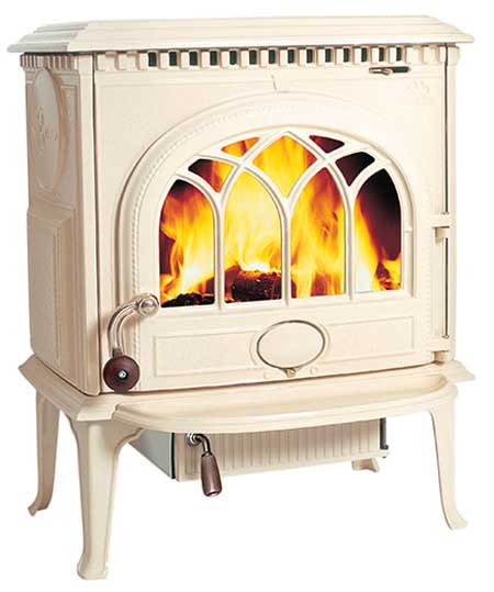 Чугунная печь белого цвета. Возможность вывода дымохода верхний/задний/боковой.