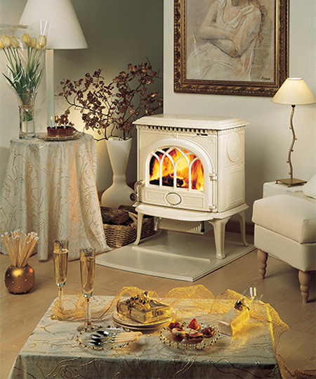 Чугунная печь белого цвета. Возможность вывода дымохода верхний/задний/боковой.