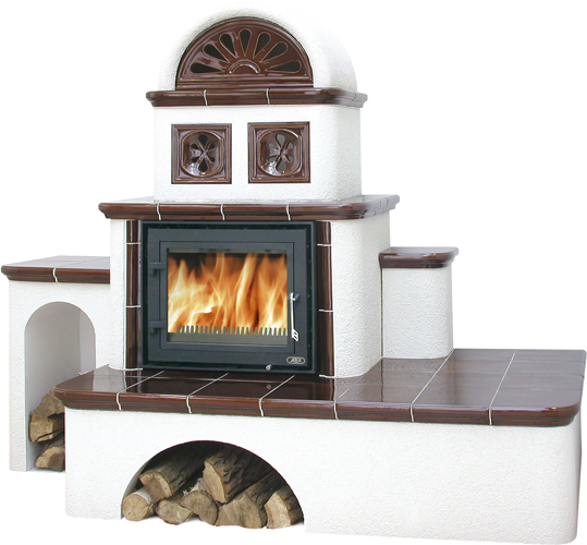 Эта кафельная печь. Снаружи выполнена кафельным изразцом. Расцветки кафеля: коричневый, зеленый.