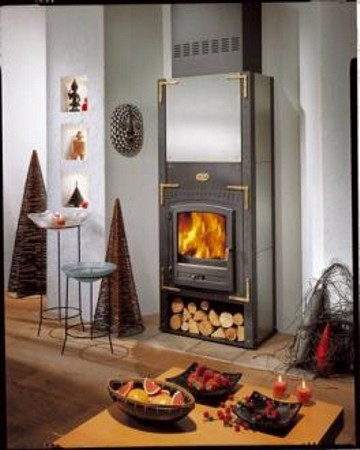 Имеется фронтальная загрузка дров. Корпус выполнен их чугуна и стали, оформлен декором.