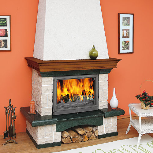 Прекрасный камин в кантри стиле, из натурального мрамора, полированного Verde и колотого Crema Marfil. Балка из дуба. Существует угловой вариант. Возможна замена полированных деталей из мрамора Verde на Crema Marfil. Совместим с топками 700 серии с прямым стеклом.