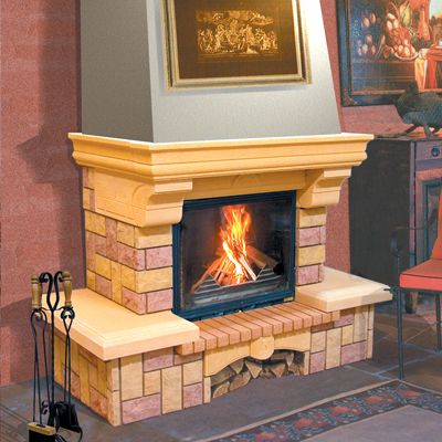 Каминная облицовка СЮИТА предназначена для отделки топок из чугуна или стали закрытого типа (с дверцей застекленной термостойким стеклом). Детали облицовки изготавливаются из натурального камня белого или желтого цвета. Конструкция облицовки "СЮИТА" рассчитана на пристенную установку. Топка СОЖ - закрытая стальная топка выпускается с 2002 г., с соблюдением норм евростандарта, снабжена системой "чистое стекло", кожухом для распределения горячего воздуха и монтажными ножками. Мощность 10 кВт.