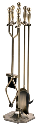 Выполненный из латуни каминный набор включает в себя 4 предмета.