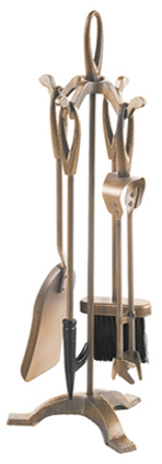 Изящный набор для камина включает в себя 4 предмета, выполненных из античной латуни.