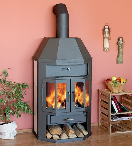 Печь-камин ZEUS. Призматический большой обзор огня. Система длительного горения. Облицована кафелем. Чугунный колосник.
